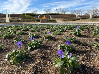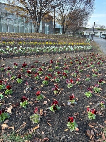 カフェレストラン前の花壇では、パンジーを植栽しております。「彩りの広場/北エリア」