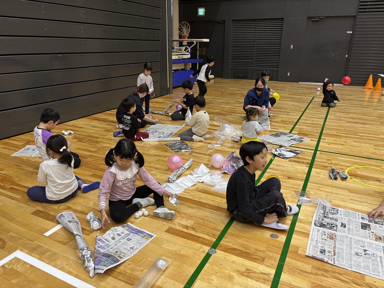 こどもたちに体を動かす楽しさを知っていただくため、親子で実践いただく「親子de運動あそび」を行い、その後、こどもたちには家にある新聞紙や袋、風船などを使用した「自由遊び」を、保護者には、こどもの頃からの運動習慣の重要性を知っていただくため「運動講習会」を実施し、41組95名の方にご参加いただきました。